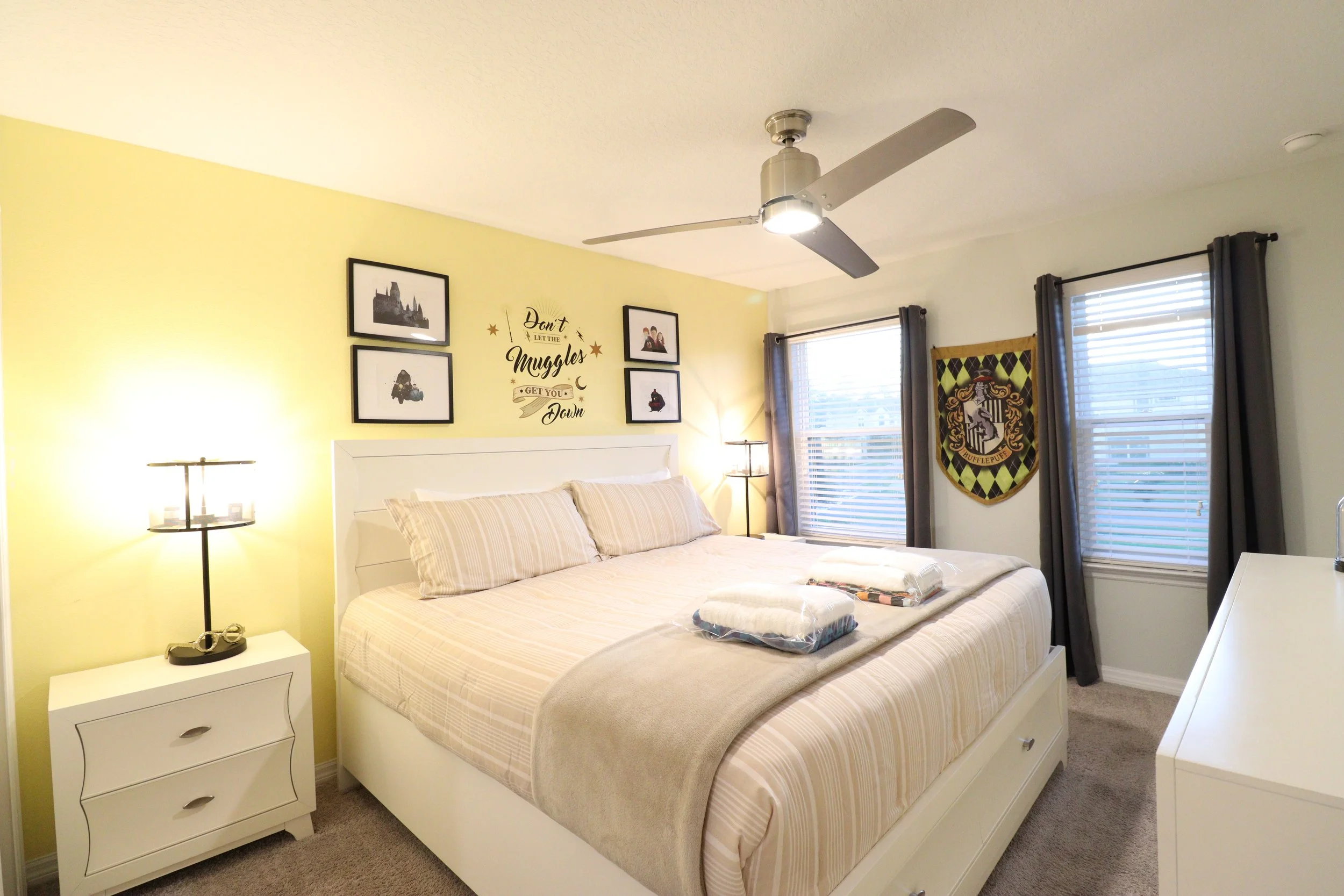 This Harry Potter themed King Suite has a full ensuite bathroom, a large walk in shower, single sink vanity with plenty of counter space. This bedroom also features tons of storage, a flat screen television and a large ceiling fan.