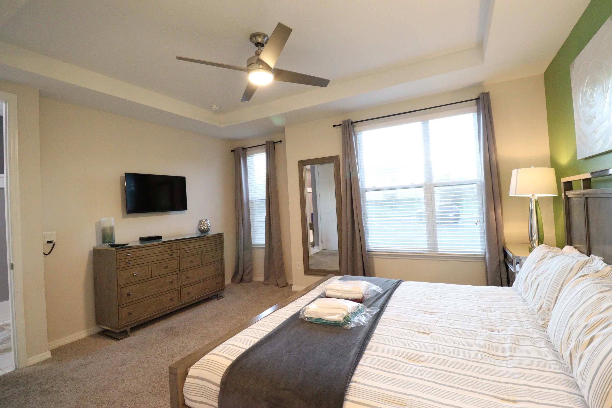 Main level Primary Suite #1 is located just off the entryway. This luxurious Primary Suite comes with its own full size ensuite bathroom with double sinks, walk in shower, king size bed, flat screen television and a large ceiling fan.