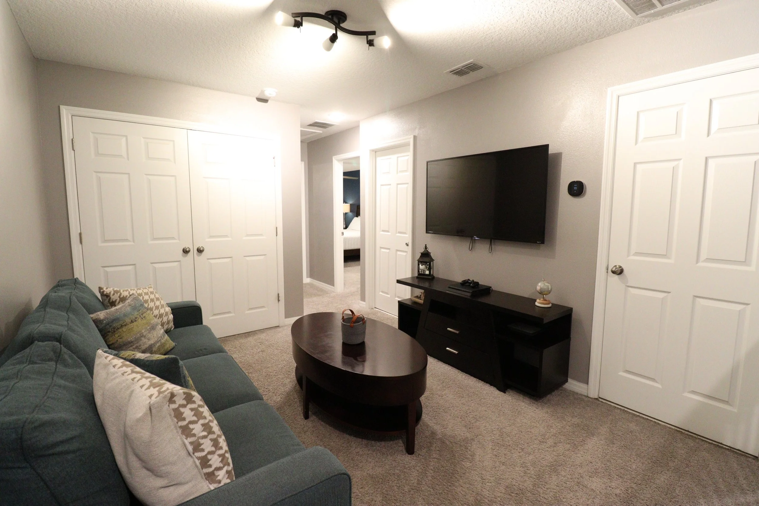 Here is where the fun really starts. This can be the kids hideaway or the mancave! A large sofa with a flat screen television and a gaming system! What else could you possibly need?